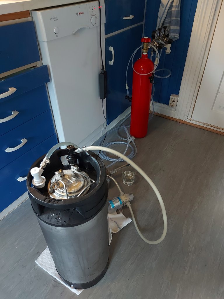 Karbonering av cider. Pumpe, CO2 og corneliusfat. Hurtig og fin måte å få kullsyre. Ikke bunnfall heller, som med sukkerkarbonering.