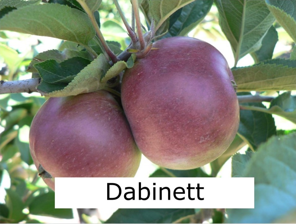 Dabinett cider apple trees. A classic English hard cider apple variety, which produces a full bittersweet juice. It is also one of the most reliable and easy cider varieties to grow. Unlike many hard cider varieties which are best-used for blended ciders, Dabinett can also be used to produce a single-varietal full-bodied medium-dry cider.