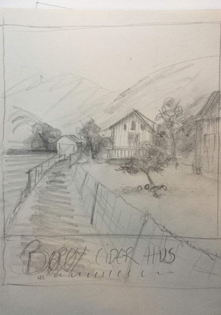 Bilder og utrykk er jo en stor del av hennes liv, så hun var bestemt og forklarende på hva som var mulig og ikke mulig. Litt frem og tilbake, så kom vi opp på en løsning. Denne blir laget som et maleri 50x60cm som skal henge på vegg i huset, men også være underlaget for etiketter og Logo. For boksenes logo, blir dette hovedbilde/logo. Siden jeg vil ha heldekkende etikett på boksene, så vil det være litt tekst om plassen, ideen osv. Felt for QR(limes på siden, eller trykkes på). alkohol prosent, produksjonsmåte.