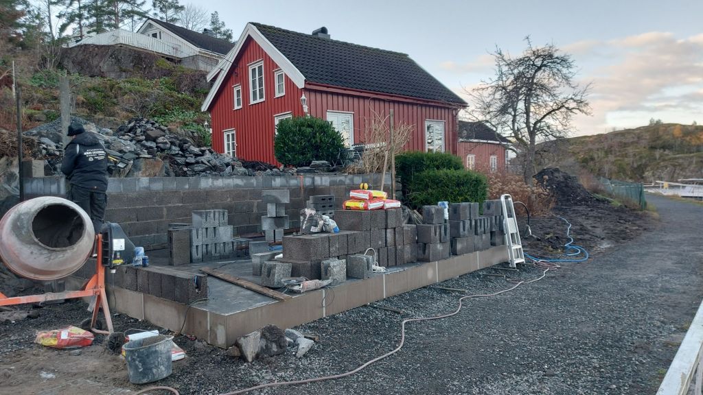 Bildet var i morges og det er kommet tre rader til på muren i dag. Artig å mure selv, men trygt med Kenneth i bakgrunnen om det skulle være noe.