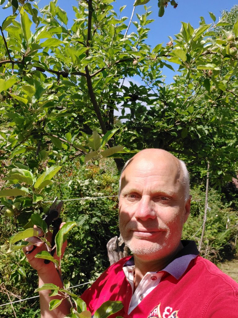 Terapi for sjelen og bruke 3-4 timer i eplehagen. Kikke på hvordan det går med trærne og rydde langs kantene i eplehagen for bjørnebær mm.