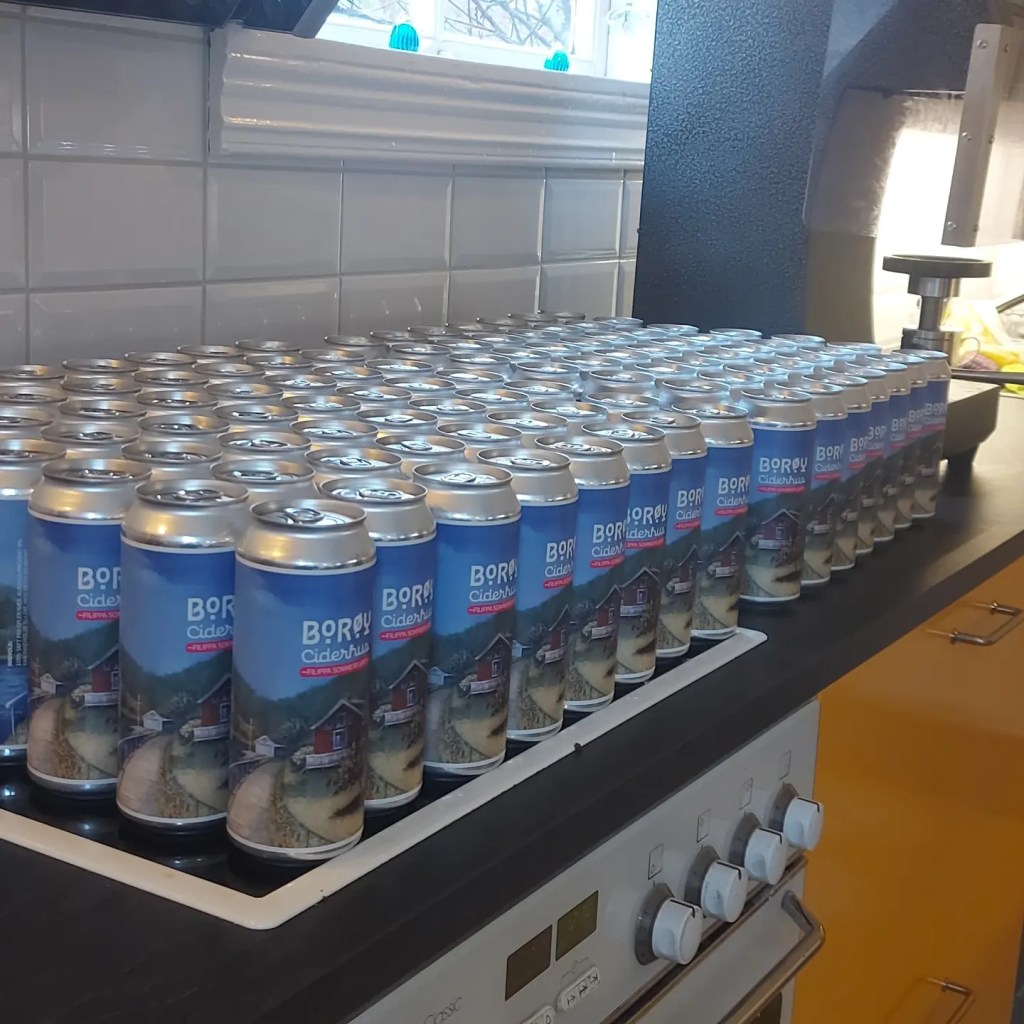 18. mars fikk vi endelig justert inn vår etikettmaskin, som manglet en 1 cm plass fordi vår heldekkende etikett var for lang. Litt Pompel og plitt, så var vi i gang. Var herlig å se over 100 bokser stå å skinne på kjøkkenbenken. Er gøy å plukke, presse, fermentere, racke, filtere, karbonere, bokse og sette på etiketter. JA, det er endel arbeid..